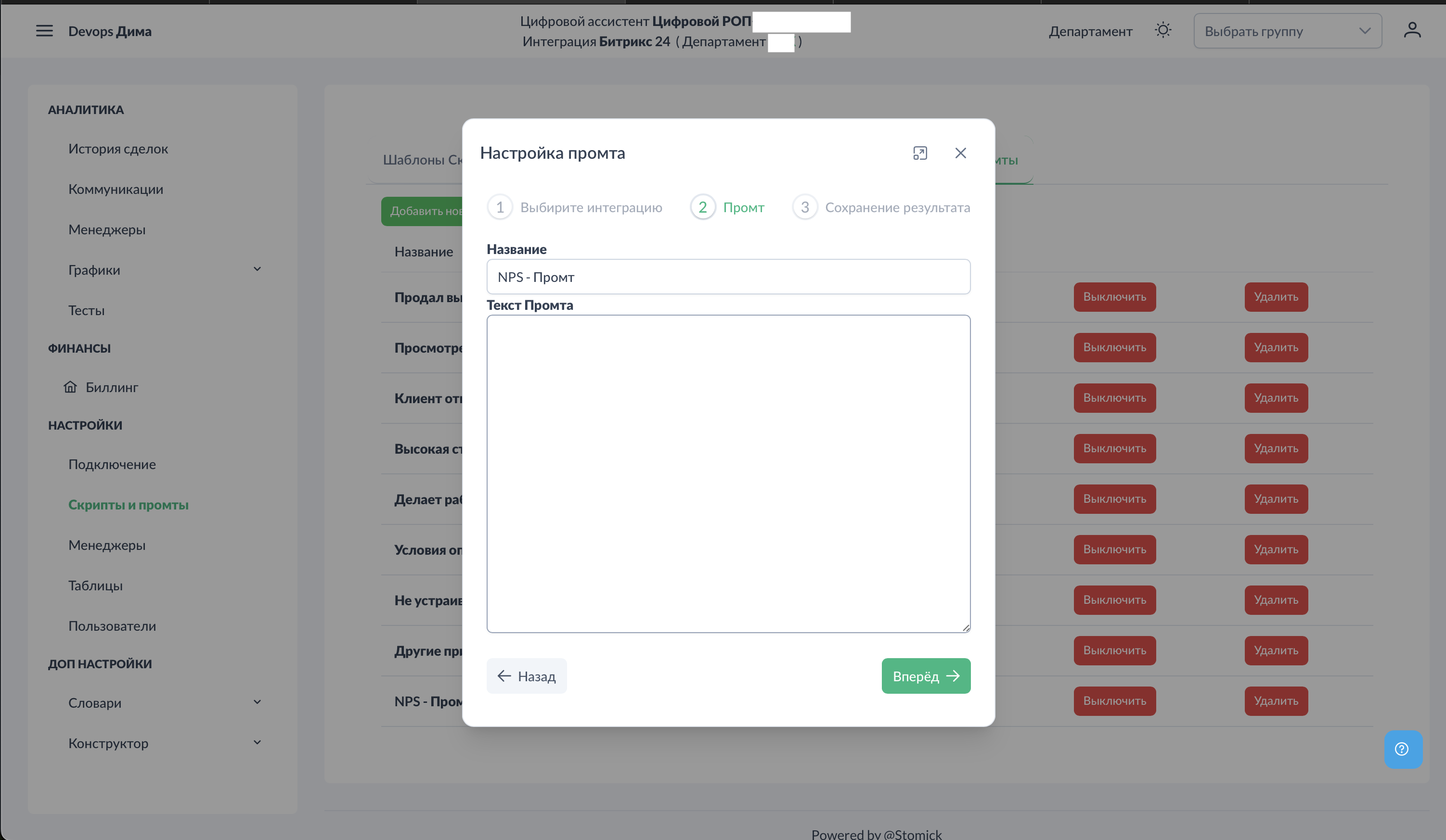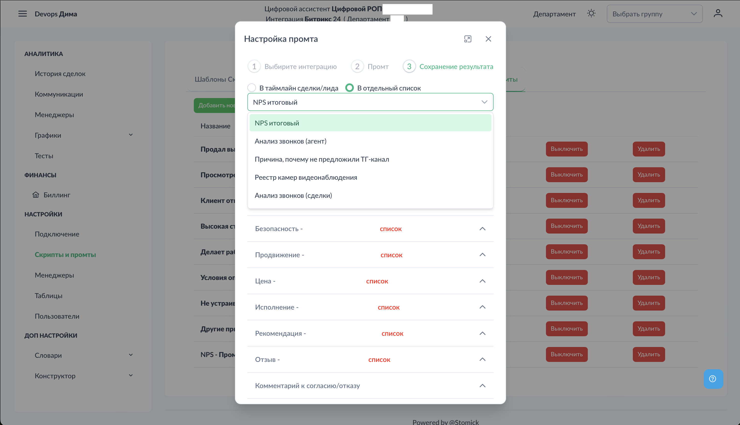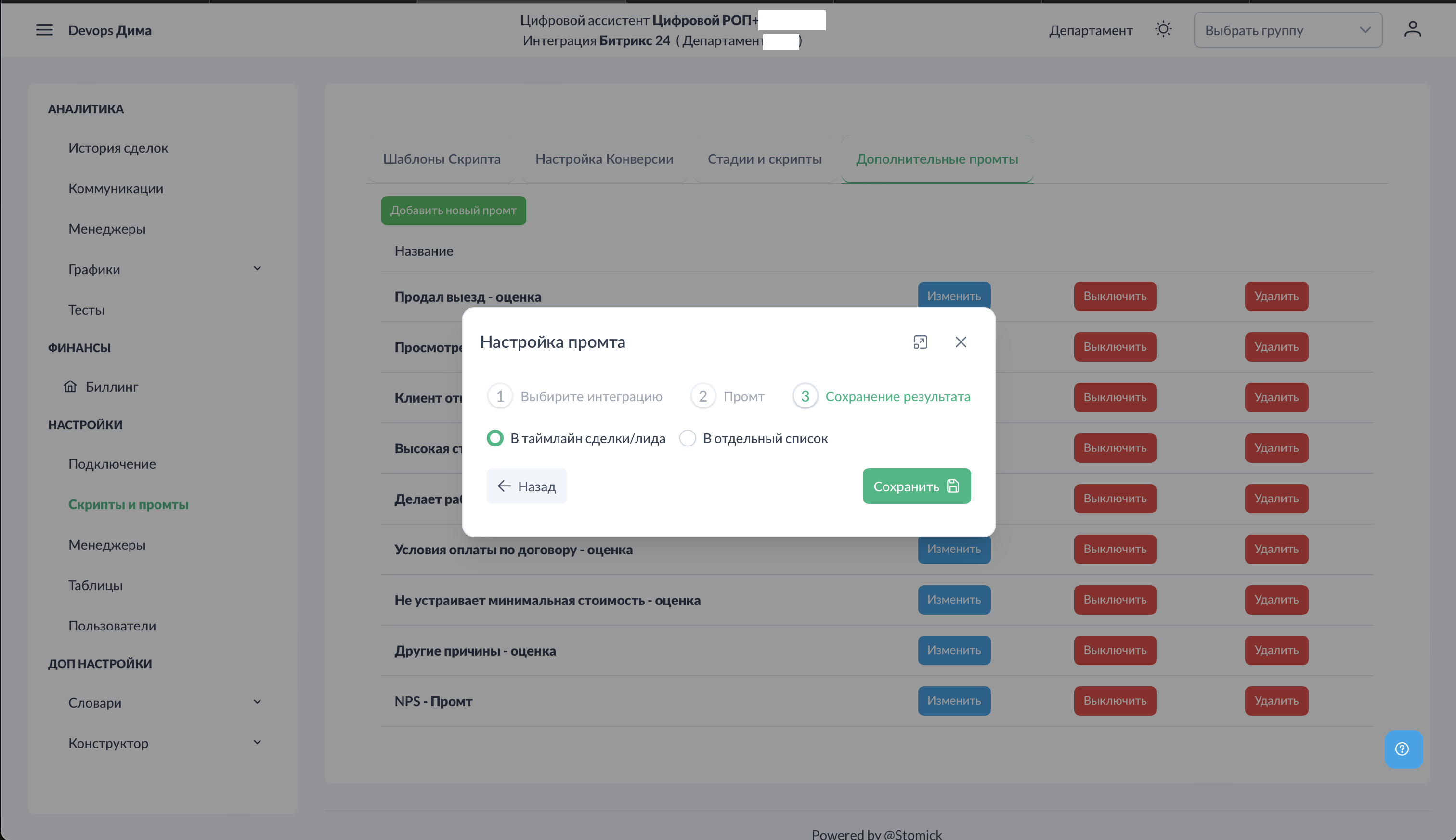 Выберите: - Интеграция — Битрикс24, AmoCRM или MacroCRM (зависит от подключённой системы) - Воронка — для какой воронки применяется промт - Стадия — для какой стадии применяется промт