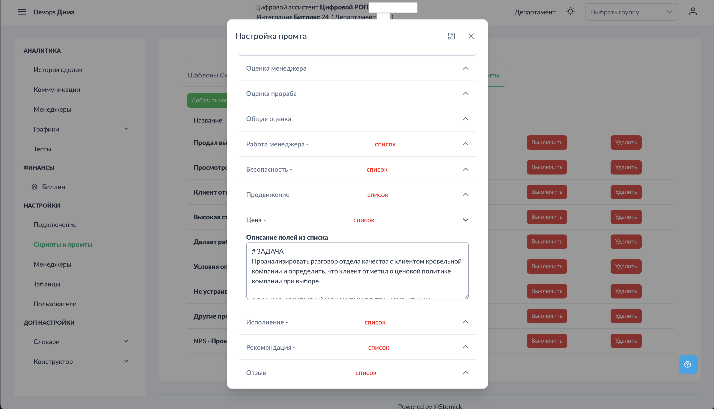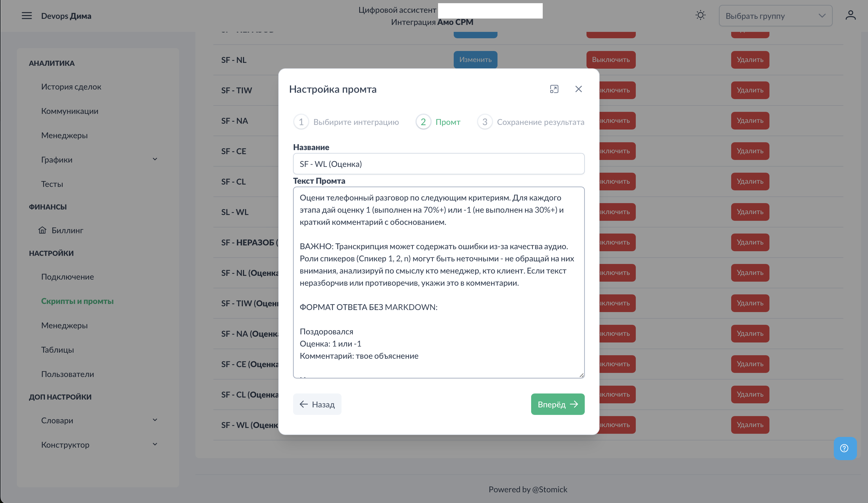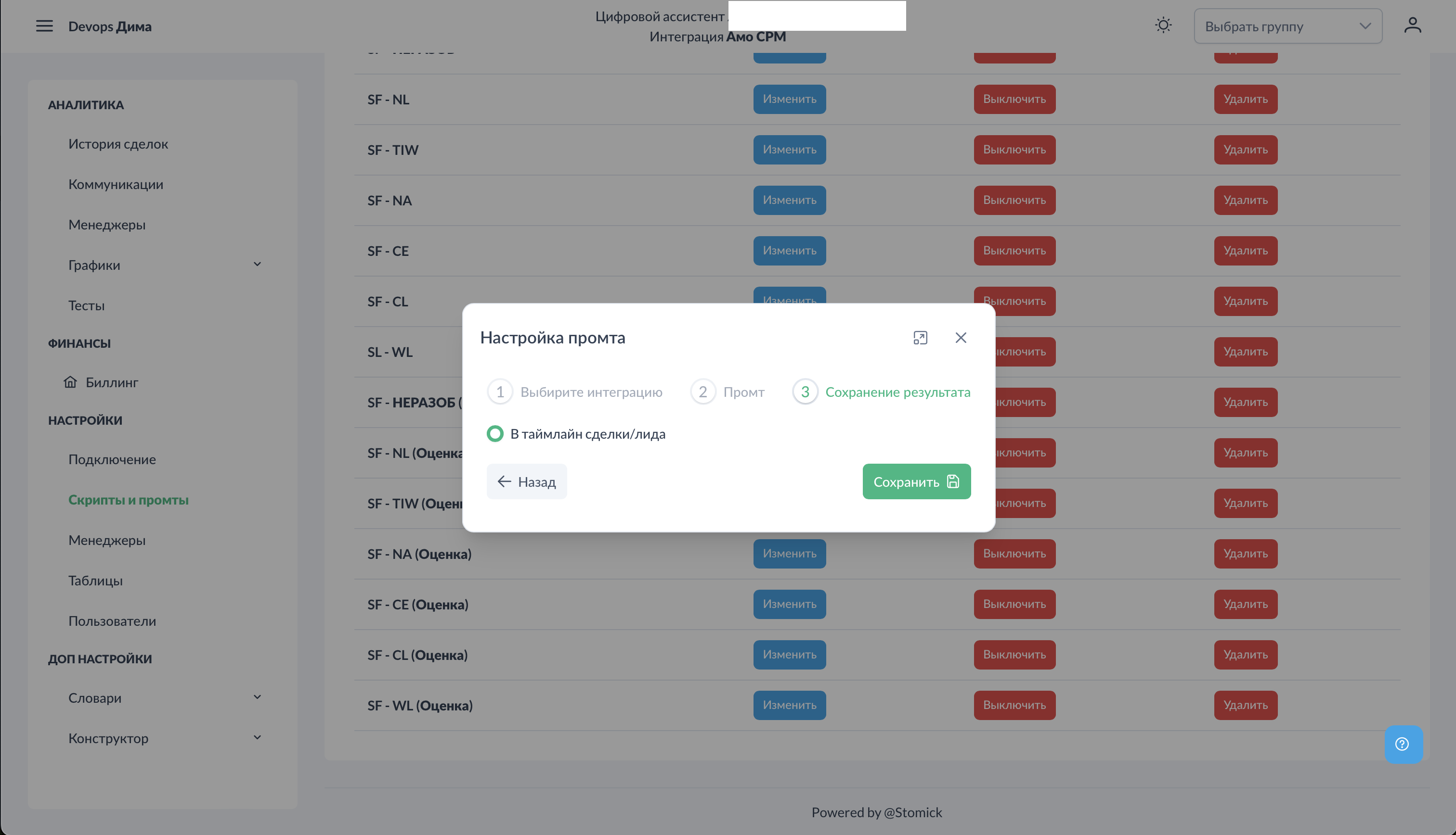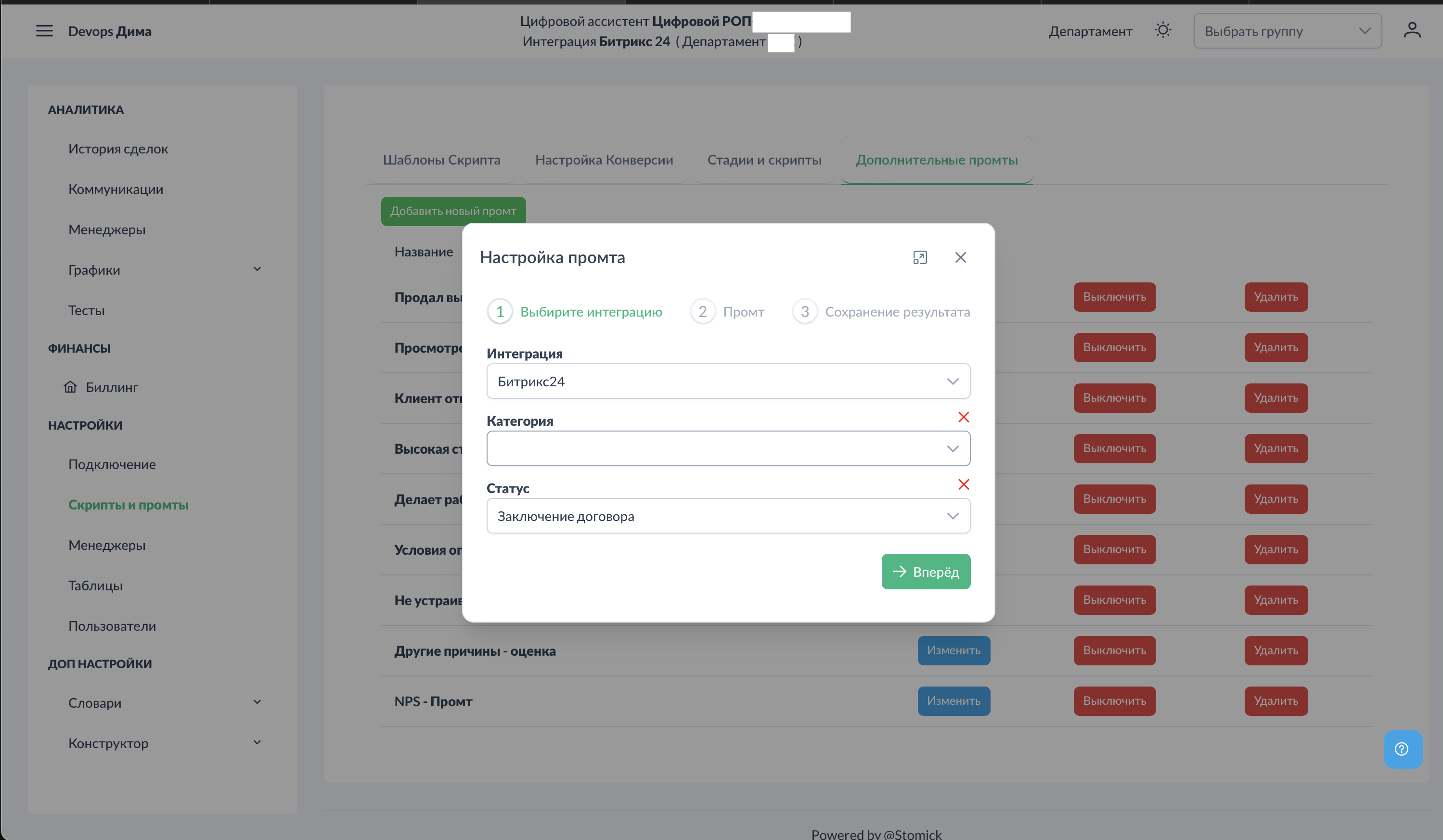 Выберите: - Интеграция — Битрикс24, AmoCRM или MacroCRM (зависит от подключённой системы) - Воронка — для какой воронки применяется промт - Стадия — для какой стадии применяется промт