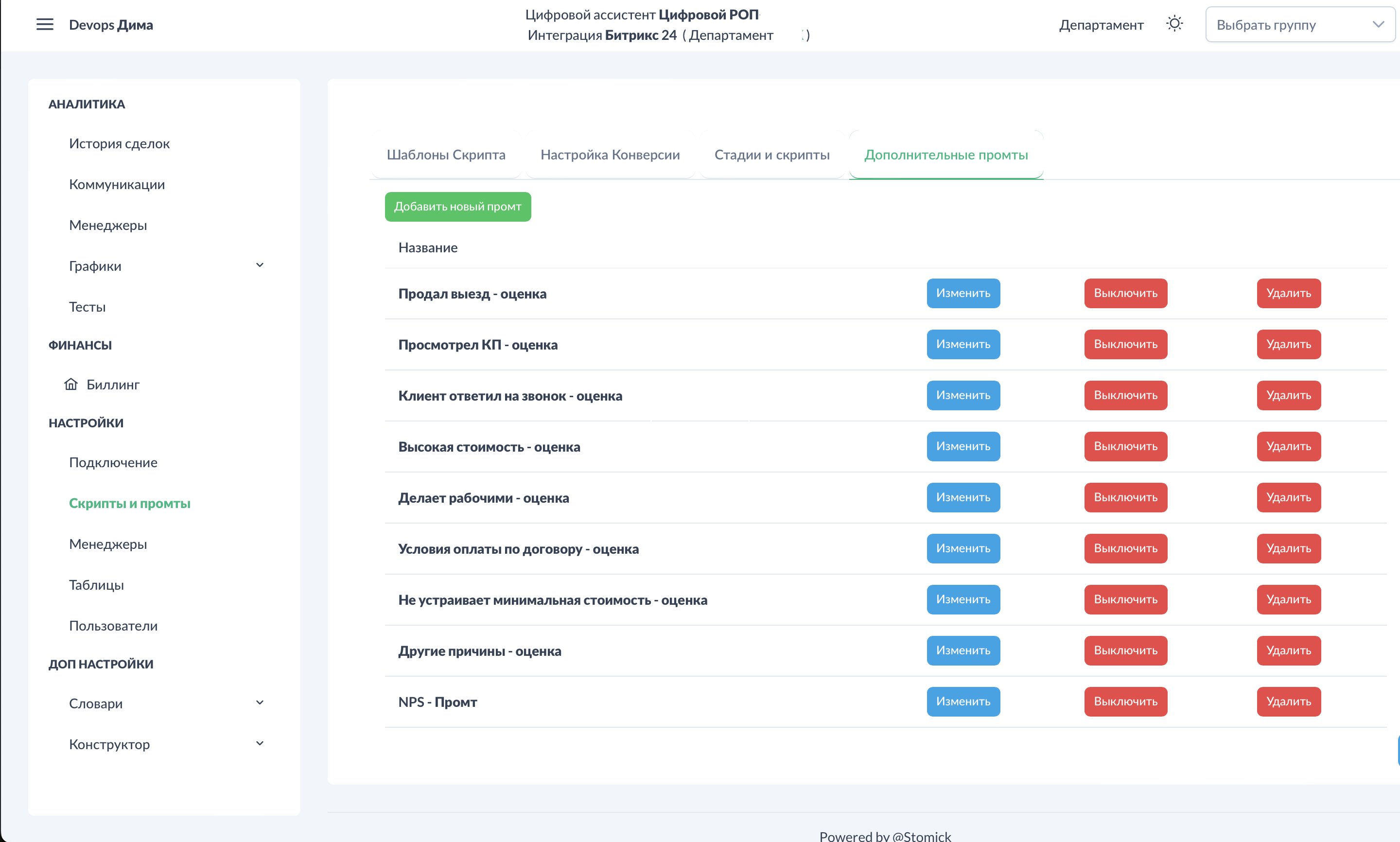 Для телефоний (Новофон, МТС) и Яндекс Диска воронки и стадии настраиваются в разделе Скрипты и промты.