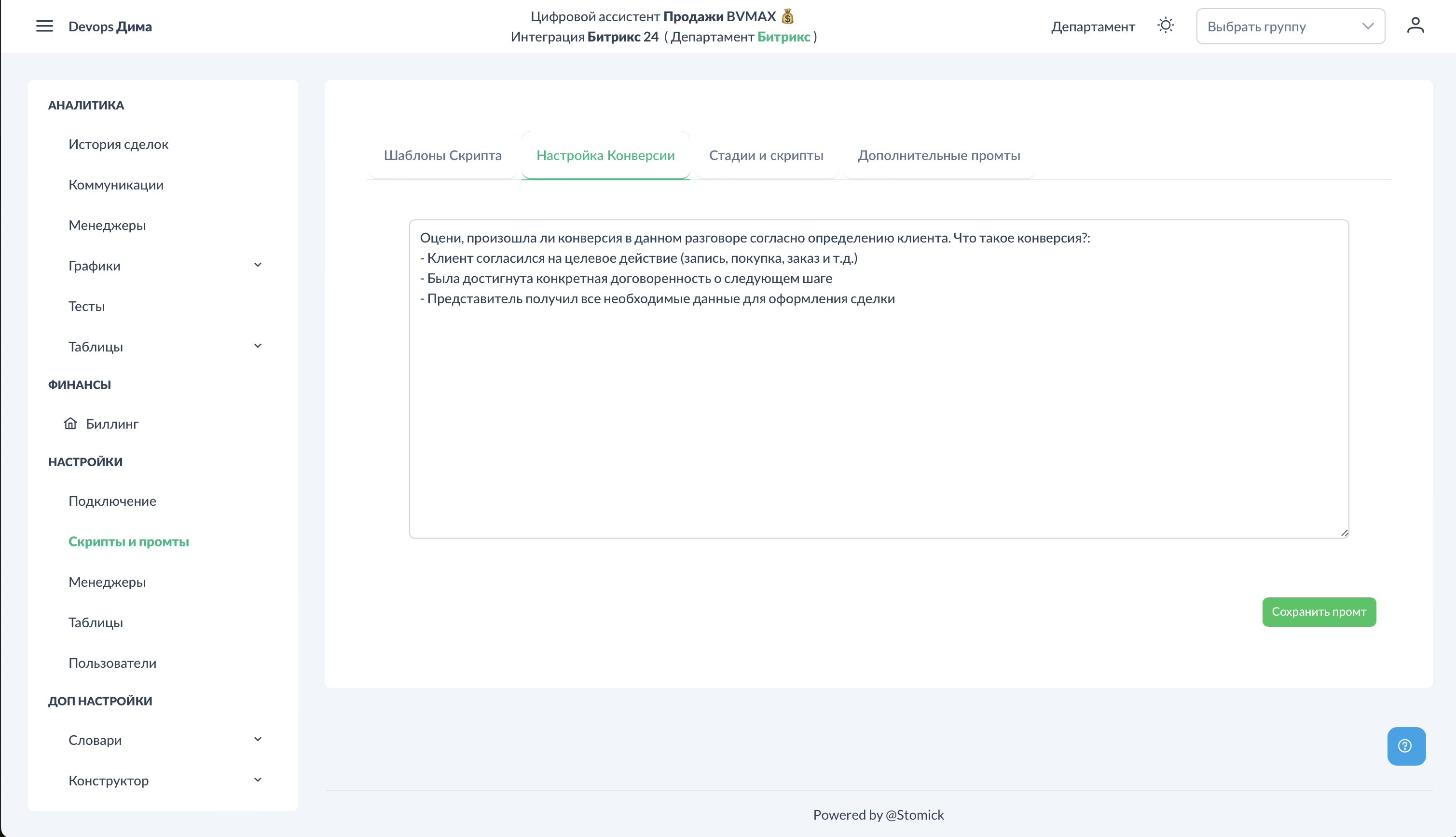Перейдите в Настройки → Скрипты и промты → Настройка конверсии.
