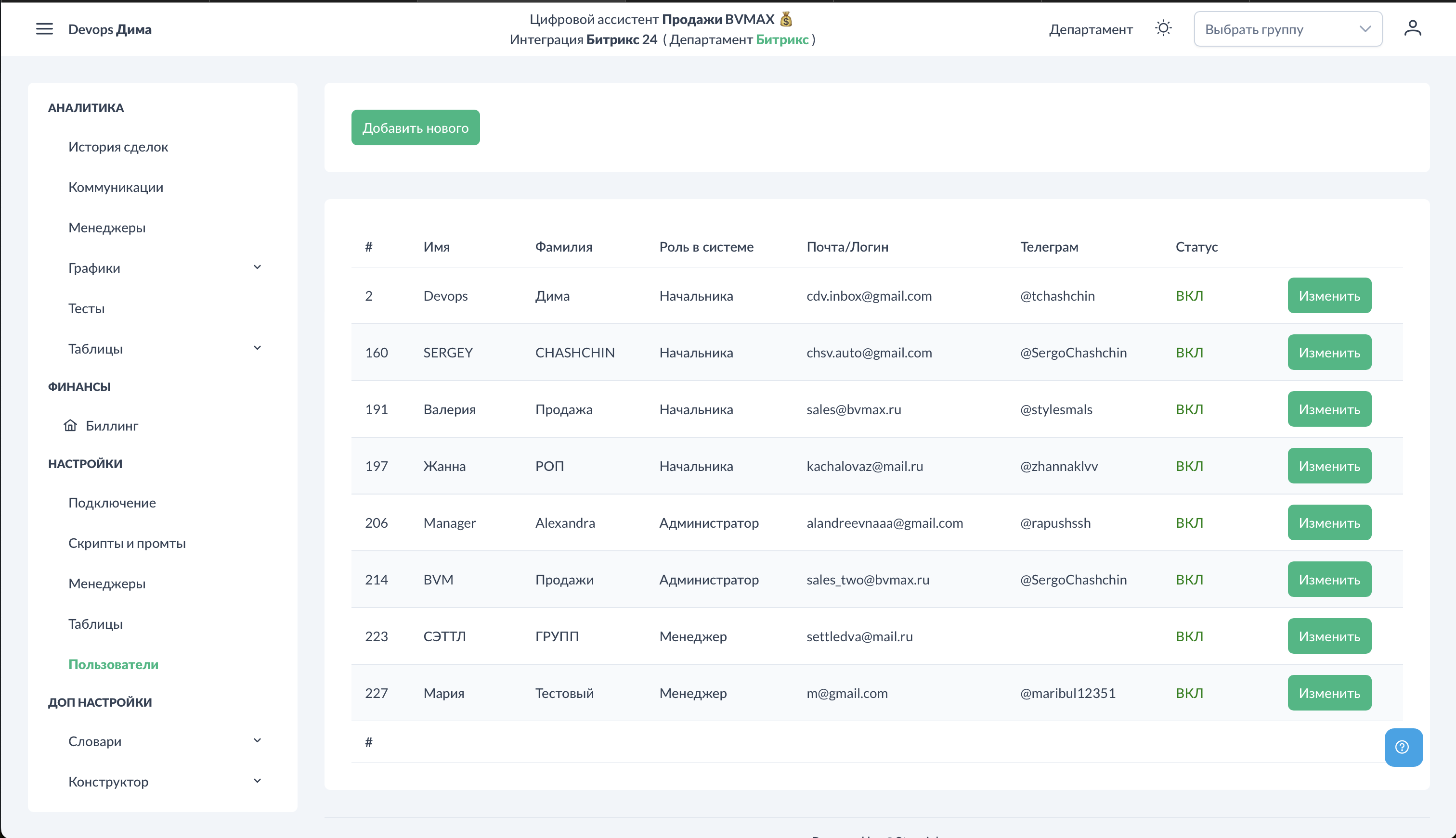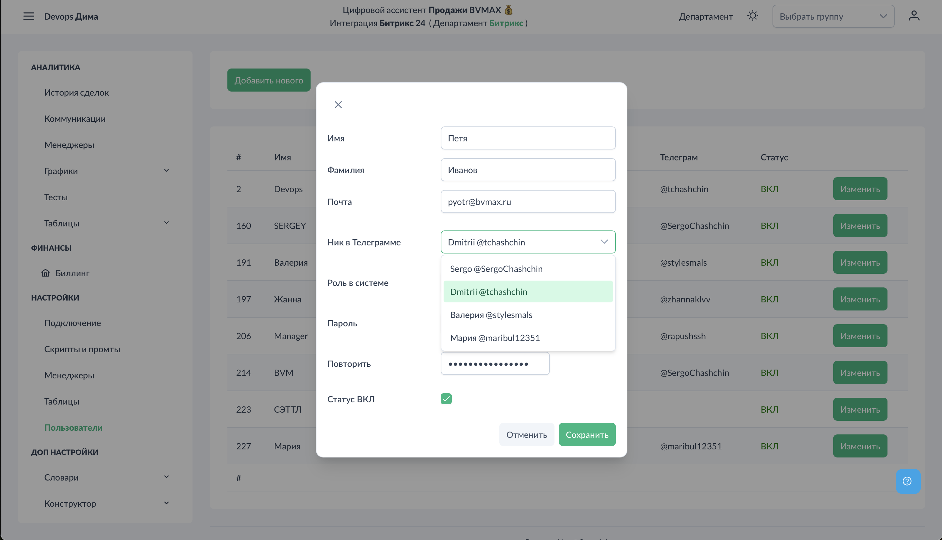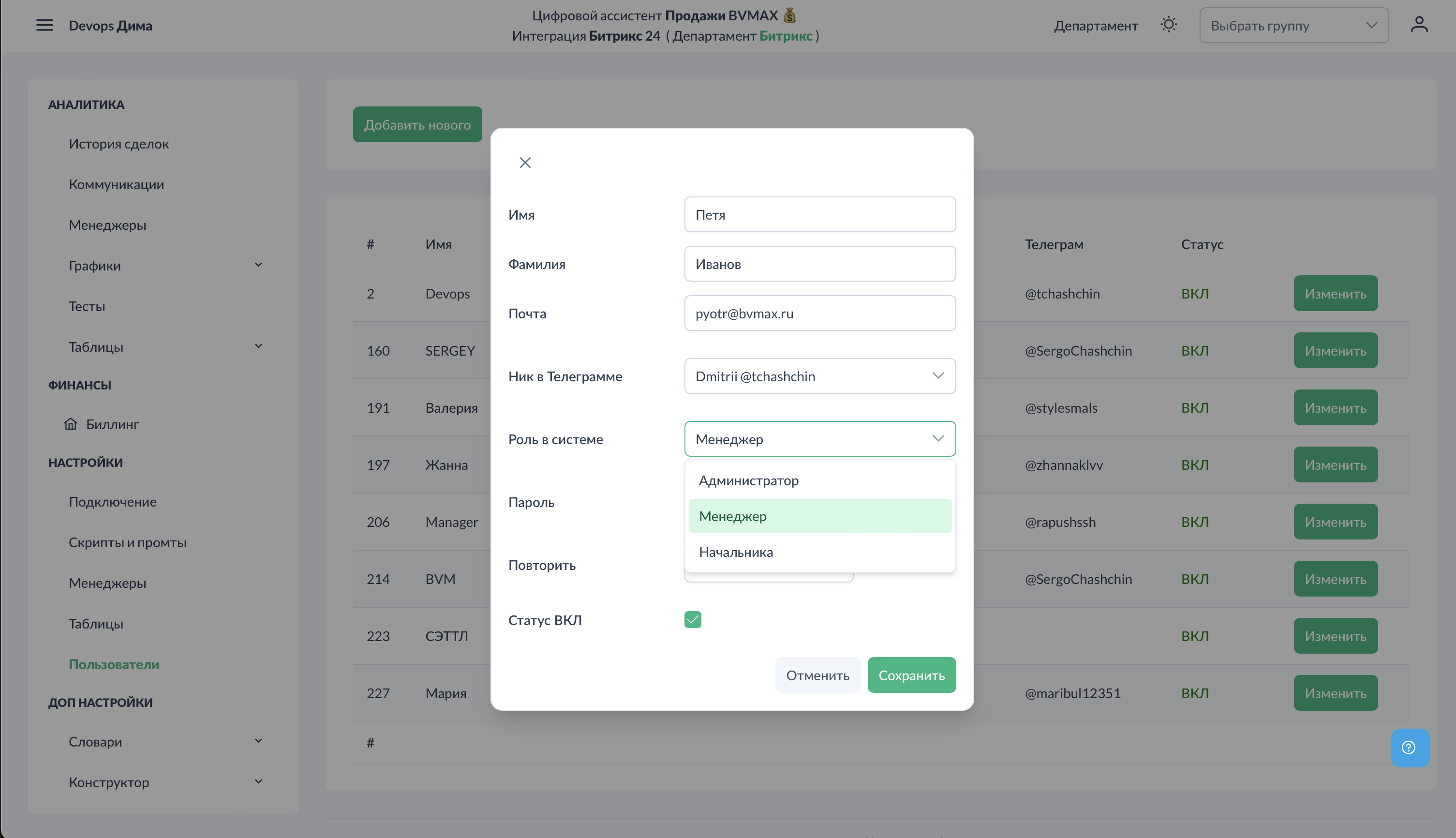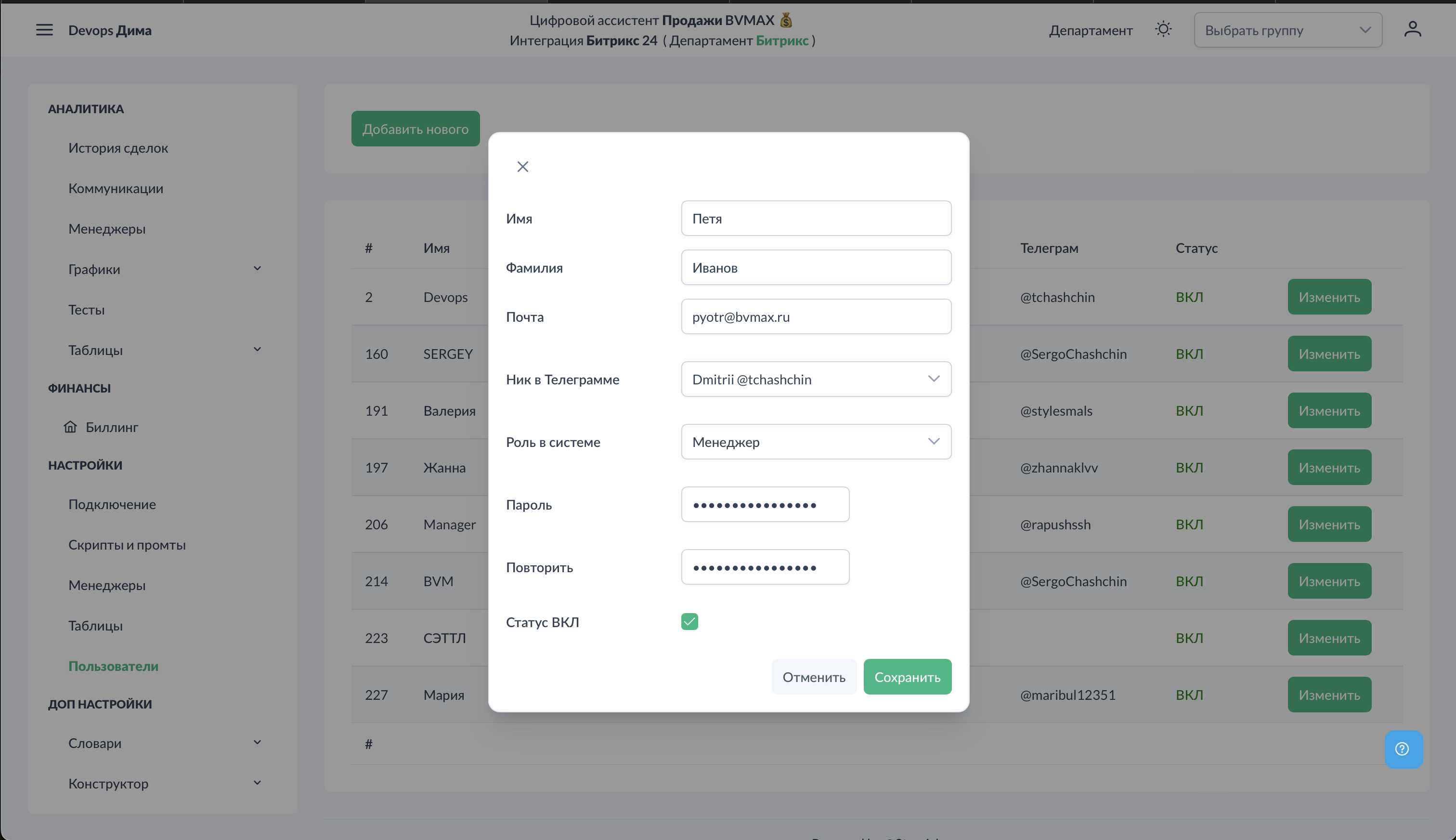 В разделе "Пользователи" добавляются аккаунты для менеджеров и руководителей. Это необходимо для входа в систему, получения тестов и отчётов.